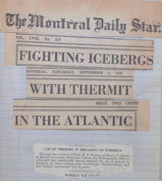 Barnes, Notebook – Seventh Iceberg Research Expedition, Newfoundland, 1926, p185. Montreal Star, Headline, Fighting Icebergs with Thermit, Sept. 4, 1926.